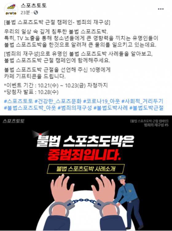 이벤트에 참여하기를 원하는 사람은 스포츠토토 페이스북 페이지를 방문해 ‘좋아요’를 누르고, 댓글로 불법스포츠도박 근절 선언을 남기면 응모가 완료된다. 참여한 팬들 중 정답을 맞힌 10명에게는 추첨을 통해 커피 기프티콘을 증정한다.