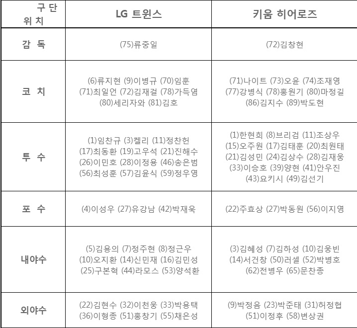 키움과 LG는 오는 11월 1일 오후 2시 서울 잠실 구장에서 2020 KBO 리그 와일드카드 결정전 1차전을 치른다. 한국야구위원회(KBO)는 경기를 하루 앞둔 10월 31일, 양 팀의 출장 엔트리 30명을 발표했다.
