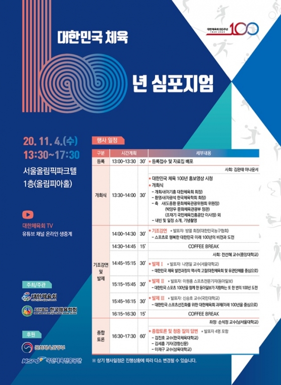 대한체육회(회장 이기흥)는 한국체육학회와 공동 주최·주관으로 오는 4일 오후 1시 30분부터 서울올림픽파크텔 올림피아홀에서 '대한민국 체육 100년 심포지엄'을 개최한다고 3일 밝혔다.