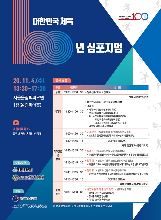 먼저, 방열 대한민국농구협회장이 ‘스포츠로 행복한 대한민국 미래 100년의 비전과 도전’을 주제로 기조 강연에 나선다. 이어 전선혜 중앙대 교수의 사회로 ▲ 대한민국 체육 발전과정의 역사적 고찰(나영일 서울대 교수), ▲ 대한민국 스포츠 100년을 함께 한 동아일보가 지향하는 또 한 번의 100년 도전(이원홍 동아일보 스포츠전문기자), ▲ 대한민국 스포츠선진화를 위한 대한체육회 과제(신승호·국민대 교수)에 대한 발제가 이어진다.