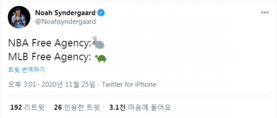 신더가드는 25일(한국시간) 자신의 SNS에 "NBA FA 시장은 토끼지만 MLB FA는 거북이"라는 짤막한 글을 남겼다.