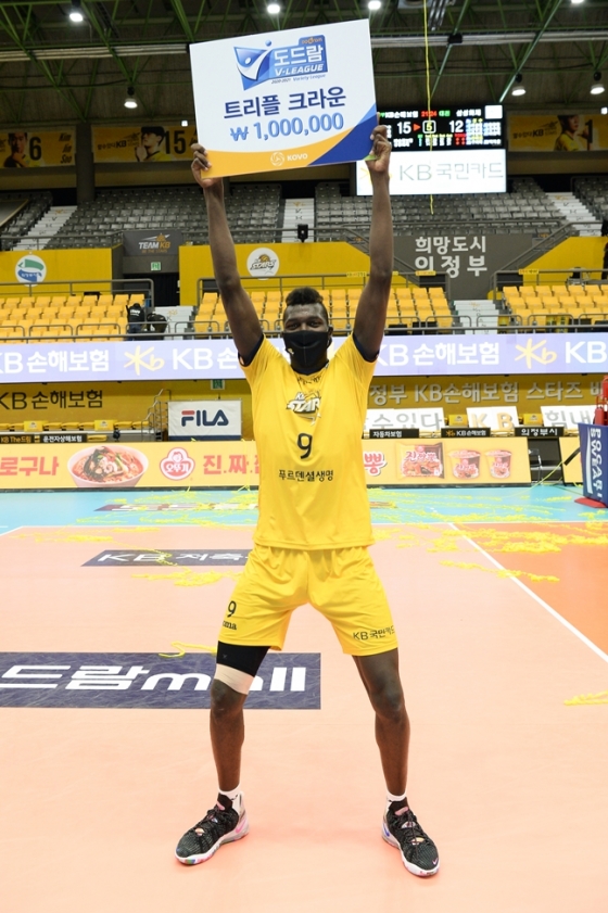 매 경기 트리플 크라운을 아쉽게 놓쳤던 '말리 특급' 노우모리 케이타(19·KB손해보험)가 10경기 만에 해냈다. 사령탑의 믿음 속에 점점 더 강해지고 있다.
