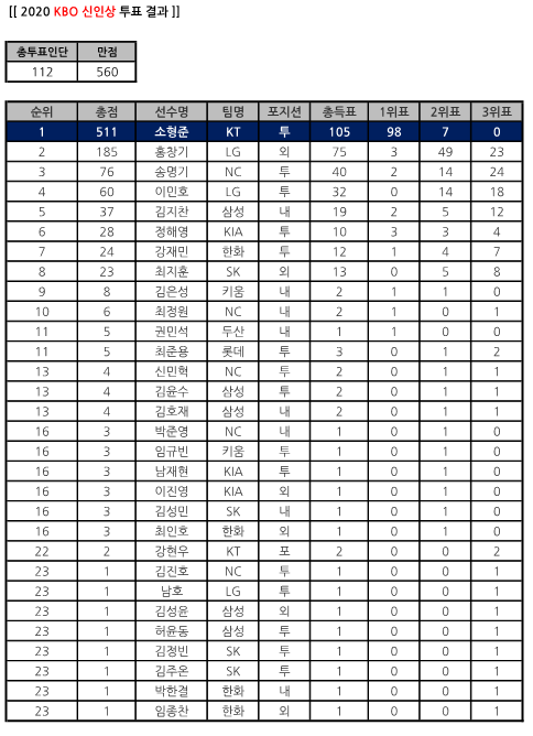 이번 신인상 투표에는 올해 KBO 리그 담당 한국야구기자회 소속 언론사 및 각 지역 언론사의 취재 기자 등 총 112명이 참여했다.
