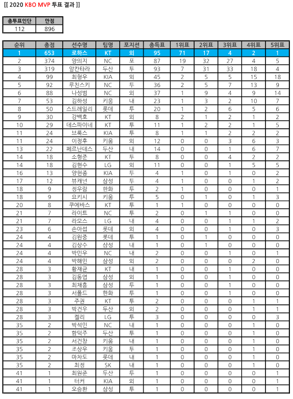 로하스는 1위표 71장, 2위표 17장, 3위표 4장, 4위표 2장, 5위표 1장을 각각 받았다. 로하스 역시 총 투표인단 112명 중 17명이 그를 외면한 셈이 됐다. 뒤를 이어 양의지(NC)가 374점, 알칸타라(두산)가 319점, 최형우(KIA)가 99점을 각각 기록했다.