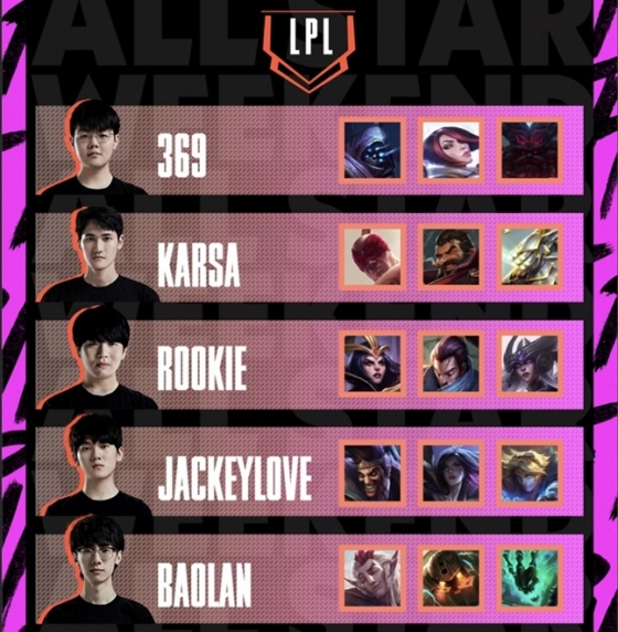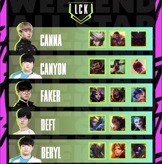 LCK는 칸나(카밀, 제이스, 오른), 캐니언(그레이브즈, 니달리, 리 신), 페이커(르블랑, 제드, 누누와 윌럼프), 데프트(이즈리얼, 사미라, 징크스), 베릴(판테온, 레오나, 알리스타)가 선정됐으며, LCK와 맞붙을 LPL은 369(잭스, 피오라, 오른), 카사(리신, 그레이브즈, 마스터 이), 루키(르블랑, 야스오, 신드라), 잭키러브(드레이븐, 카이사, 이즈리얼), 바오란(라칸, 노틸러스, 쓰레쉬)가 선택됐다.