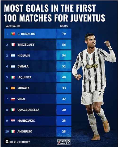 16일 유럽 이적 전문매체 ‘트랜스퍼마르크트’는 유벤투스에서 뛰었던 선수들을 대상으로 100경기 출전 시 최다득점 순위를 정리했다. 1위는 예상대로 호날두였다.