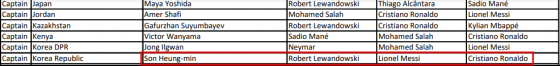 손흥민(28·토트넘)의 선택은 레반도프스키(32·바이에른 뮌헨), 리오넬 메시(33·바르셀로나), 그리고 크리스티아누 호날두(35·유벤투스) 순이었다.