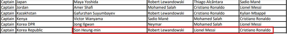 그럼 한국 대표팀 주장 자격으로 투표자로 나선 손흥민은 누구에게 표를 던졌을까. FIFA가 공개한 자료에 따르면 손흥민은 1위표(5점) 레반도프스키, 2위표(3점) 메시, 3위표(1점)로 호날두를 각각 선택했다.