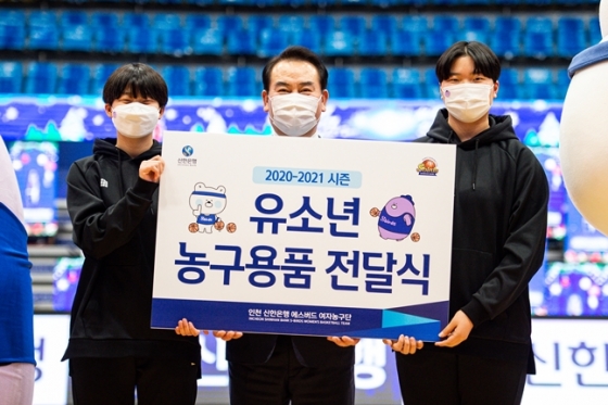 인천 신한은행 여자농구단은 18일 열린 용인 삼성생명과 홈경기에서 연고지 초·중 여자농구 육성을 위해 농구화, 트레이닝복 등 훈련용품 전달식을 개최했다.