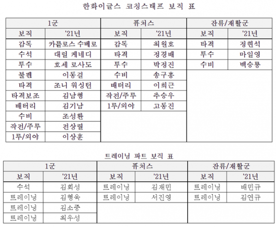 한화는 "코치진 구성 완료에 따라 향후 1군과 퓨처스, 잔류/재활군에 이르기까지 일원화된 시스템으로 코칭이 진행될 수 있도록 전략적인 소통과 교류를 진행해 나갈 방침"이라고 밝혔다.