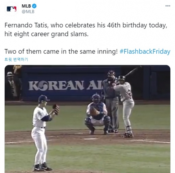 메이저리그 공식 트위터 계정은 2일(한국시간) "페르난도 타티스가 오늘 본인의 46번째 생일 맞았다. 통산 8개의 만루 홈런을 친 그 타자다. 이 중 2개는 한 이닝에서 때려냈다"는 설명과 함께 2분 17초짜리 영상을 게시했다. 이 영상에 박찬호가 등장한다.