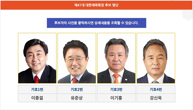 이번 제41대 대한체육회장 선거에는 ▲이종걸 민족화해협력범국민협의회 대표 상임의장 ▲유준상 대한요트협회장 ▲이기흥 제40대 대한체육회 회장 ▲강신욱 단국대학교 스포츠과학대학 국제스포츠학부 교수 등 총 4명의 후보자(이상 기호순)가 출마했다.