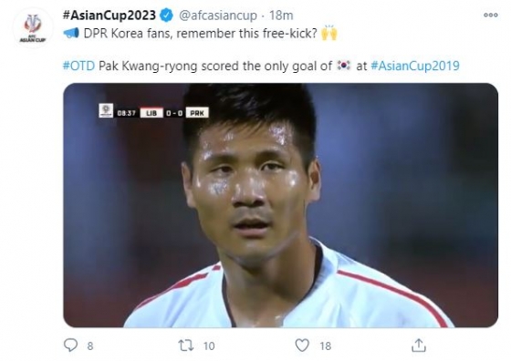 AFC 17일(한국시간) 아시안컵 공식 SNS에 2년 전 아시안컵에서 북한 축구 대표팀의 골 장면을 소개하는 영상을 올렸다.