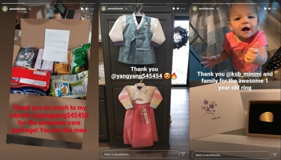 지난해 12월 12일에도 브룩스는 양현종과 김선빈이 미국으로 보낸 한국 과자와 한복, 돌 반지 등 선물을 직접 공개하기도 했다. 특히 양현종은 영어로 쓴 자필편지까지 동봉했다.