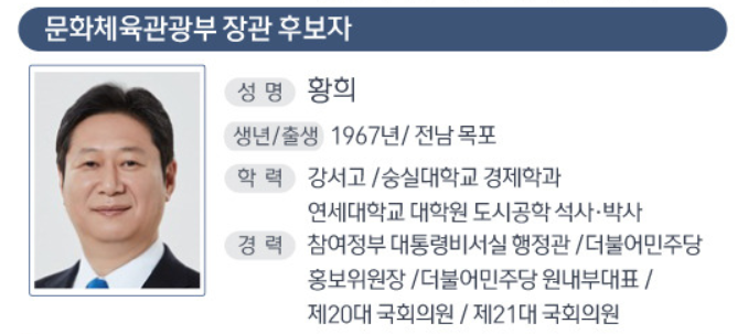황희(54) 더불어민주당 의원이 신임 문화체육관광부 장관에 내정됐다.