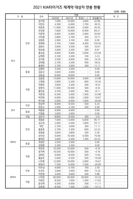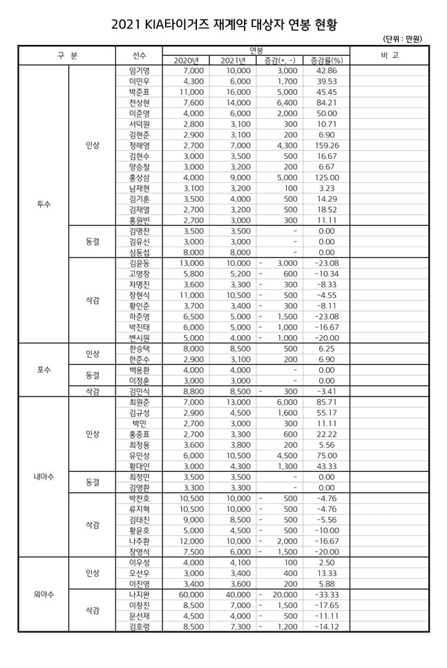 KIA 타이거즈가 27일 2021시즌 연봉 재계약 대상자 53명과 계약을 마무리했다. 재계약한 선수 가운데 인상자는 27명이며, 동결 7명, 삭감 19명이다.