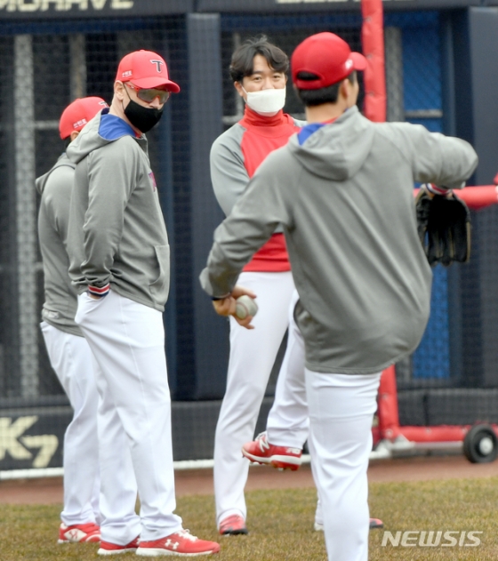투수들의 캐치볼 훈련을 지켜보는 윌리엄스 감독(왼쪽). /사진=뉴시스