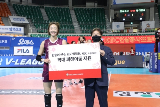 한송이(왼쪽)가 5000득점 상금을 피해아동 지원금으로 기부했다./사진=KGC인삼공사