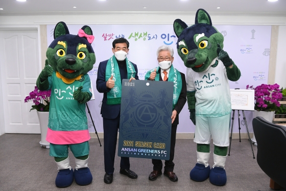 안산은 지난 15일(월) 10시 30분 안산시청 시장실에서 김호석 대표이사가 윤화섭 구단주에게 2021시즌 안산그리너스FC 시즌권을 전달했다.