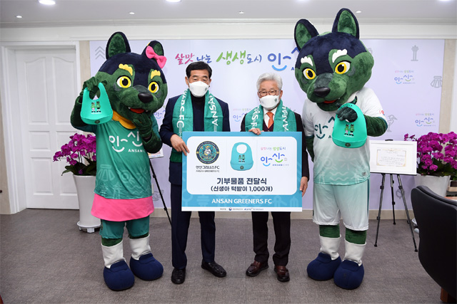 [스포탈코리아] 김성진 기자= 안산 그리너스 김호석 대표이사가 지난 15일 오전 10시 안산시청 시장실에서 윤화섭 시장에게 2021년에 태어난 안산시 신생아 1,000명에게 선착순 배포 예정인 신생아용 실리콘 턱받이를 전달했다.