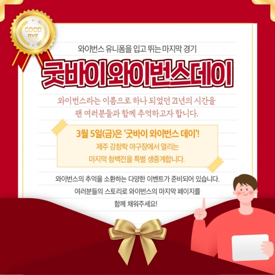 한편, 이번 '굿바이 와이번스 데이' 기념 특별 생중계는 구단 공식 유튜브 채널에서 진행되며, 자세한 시간은 추후 구단 공식 인스타그램과 페이스북 페이지를 통해 공지될 예정이다.