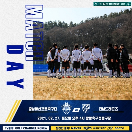 한편, 27일 오후 4시에 펼쳐지는 충남아산FC와 전남드래곤즈의 경기는 GOLF CHANNEL KOREA, 네이버, 다음, 아프리카TV, 시즌, 스팟을 통해 시청 가능하다.