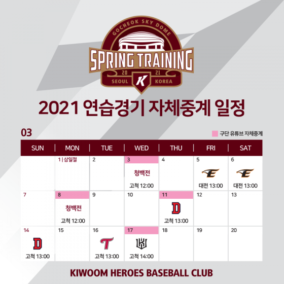 키움 히어로즈가 스프링캠프에서 진행하는 청백전과 연습경기를 자체중계한다.