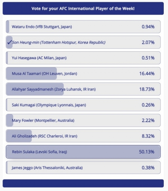 아시아 최고의 선수인 손흥민이지만 투표에서는 고전을 면치 못하고 있다. AFC가 진행하고 있는 투표에 따르면 손흥민은 2.07%의 득표율을 기록하며 6위에 올라있다. 1위는 50.13%의 레빈 술라카다.