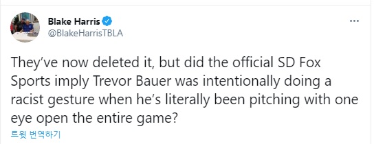 다저스 소식을 주로 다루는 트루블루에 글을 기고하는 블레이크 해리스 기자는 7일(한국시간) 자신의 SNS에 "매체 '폭스스포츠 샌디에이고'가 황급히 게시물을 삭제했다. 이는 의도적으로 인종차별적인 동작을 했다는 걸 암시하는 것인가? 참고로 이 영상은 김하성을 삼진으로 돌려세운 뒤 바우어가 했던 동작"이라는 글을 남겼다.