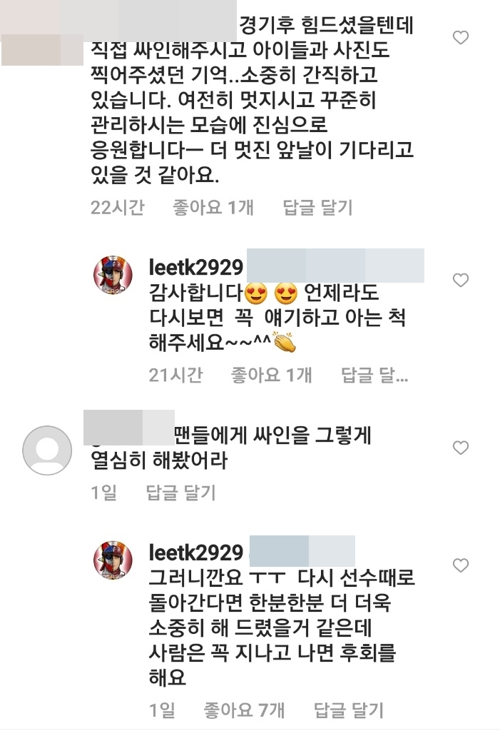 하지만 한 팬이 "팬들에게 사인을 그렇게 열심히 해봤어라"는 지적을 했다. 이에 이택근은 "그러니까요. 다시 선수 때로 돌아간다면 한 분 한 분 더욱 소중히 해드렸을 것 같은데 사람은 꼭 지나고 나면 후회를 해요"라는 답글을 적었다.