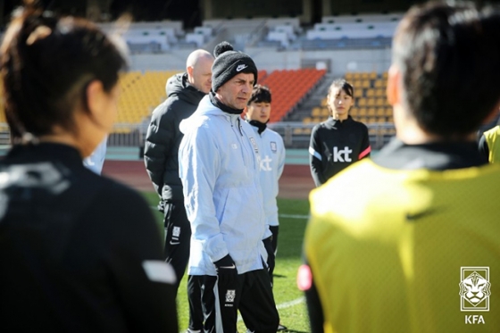 지난해 부산에서 진행된 여자축구대표팀 훈련을 지휘하고 있는 콜린 벨(가운데) 여자축구대표팀 감독. /사진=대한축구협회