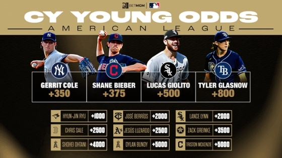 전체 1위는 +350의 게릿 콜(31·뉴욕 양키스)이었고 지난 시즌 수상자 셰인 비버(26·클리블랜드)가 +375로 2위였다. 루카스 지올리토(27·시카고 화이트삭스)와 타일러 글라스노우(28·탬파베이)가 각각 +500과 +800으로 3위와 4위를 차지했다. 모두들 아메리칸리그에서 손꼽히는 에이스로 평가받는 선수들이다.
