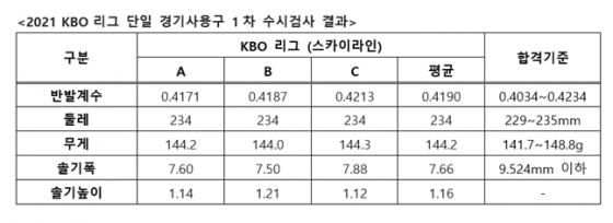 한국야구위원회(KBO)는 2021 신한은행 SOL KBO 리그 단일 경기사용구의 1차 수시검사 결과를 1일 발표했다.