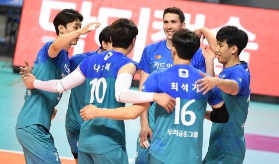 우리카드가 OK금융그룹을 꺾고 플레이오프 1차전을 기선제압했다.