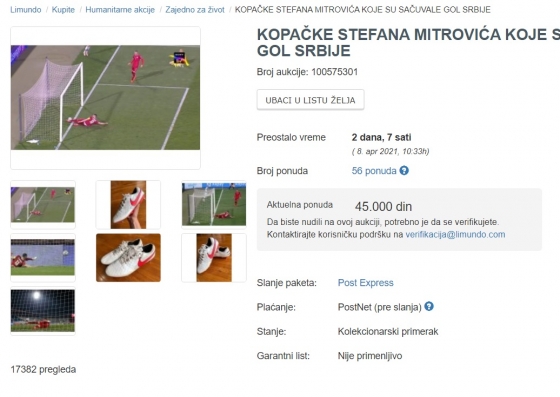 이번에는 호날두의 득점을 저지한 미트로비치의 축구화가 등장했다. 매체에 따르면 호날두의 골을 막아낸 세르비아 주장 미트로비치 축구화가 경매 사이트에 올라왔다. 일명 세르비아를 구한 미트로비치 축구화로, 모금을 위해 본인이 직접 기증했다. 경매는 오는 8일 종료된다. 세르비아 국민들의 선한 마음이 또 전해질지 관심시사다.