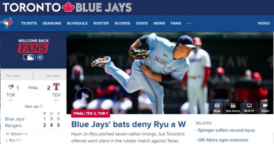 경기 후 토론토 홈페이지 메인에는 "토론토 타선이 류현진의 승리를 거부했다"는 문구가 등장했다. "비록 토론토가 패했지만, 류현진은 그 이상을 팀에 줬다. 초반 어려움을 딛고 7이닝을 소화했다. 타선이 침묵했다. 기회가 왔을 때 이를 살리는 적시타를 때리지 못했다"고 짚었다.