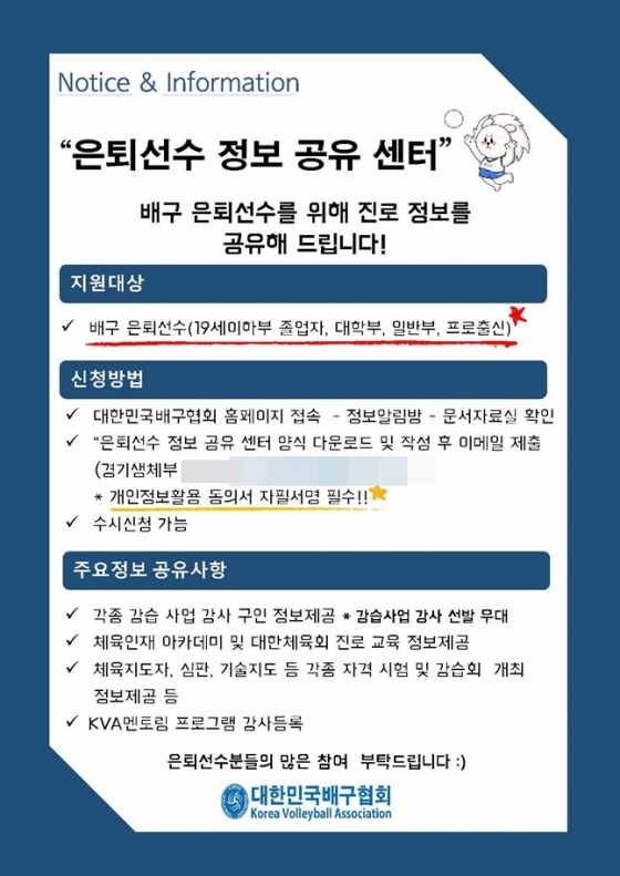 대한민국배구협회(이하 협회)는 정보공유를 통한 은퇴선수의 권익과 기회제공을 위해 '은퇴선수 정보공유센터'를 운영키로 하였다.