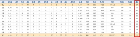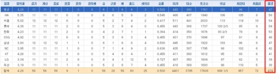 이날 경기가 끝나자 KIA는 볼넷 허용 1위에 올랐다. 11경기서 무려 58개를 내줬다. 1경기를 더 치른 키움보다도 4개가 많다. 그리고 가장 적게 내준 두산이 38개다. 10개 구단 합치면 총 474개의 볼넷이 나왔다.