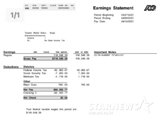 스타뉴스는 최근 한 메이저리거의 월급명세서를 입수해 그들이 세금을 어느 정도나 내는지 들여다 볼 수 있었다.