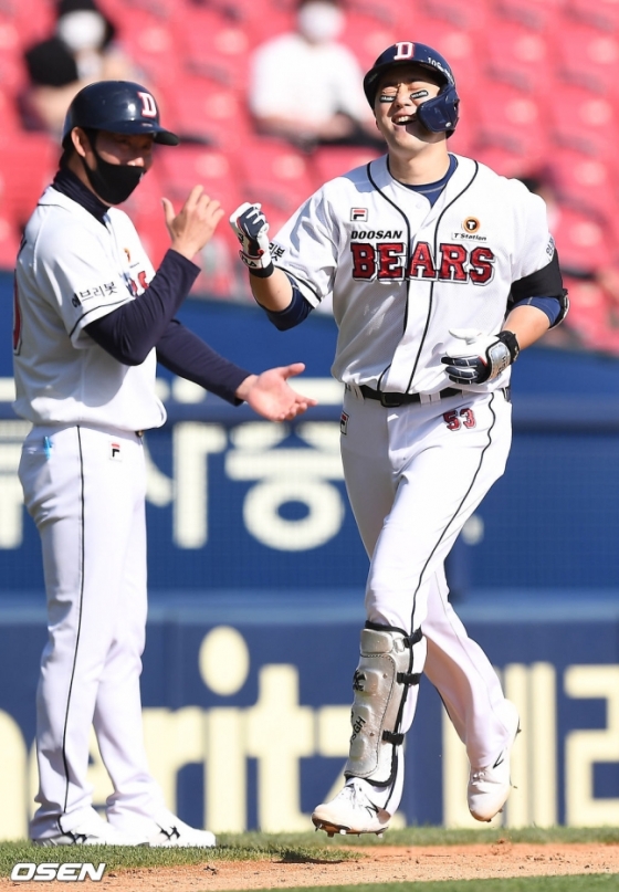 수비에서 삐끗했으나 대신 두산의 방망이가 식지 않았다. 4회말 안타와 볼넷으로 1사 1,2루가 됐고, 김인태가 좌월 3점포를 작렬시켰다. 단숨에 5-4 재역전. 김인태의 시즌 마수걸이 홈런이었다. 이날 전까지 타율 0.341을 기록하며 백업으로 좋은 모습을 보였던 김인태가 크게 한 건 해냈다.