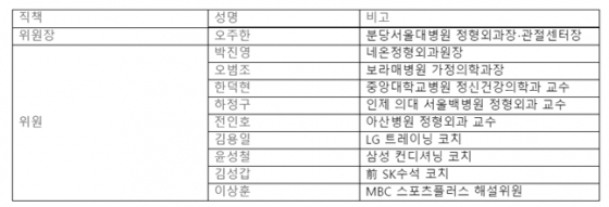 의무위원장으로는 오주한 분당서울대병원 정형외과장·관절센터장이 위촉됐고 박진영네온정형외과원장, 전인호 아산병원 정형외과 교수, 한덕현 중앙대학교 정신건강의학과 교수, 오범조 보라매병원 가정의학과장, 하정구 인제대 서울백병원 정형외과 교수, 김성갑 전 SK 수석코치, 김용일 LG 트윈스 트레이닝 코치, 이상훈 MBC 스포츠플러스 해설위원, 윤성철 삼성라이온즈 컨디셔닝 코치가 위원으로 선임됐다.