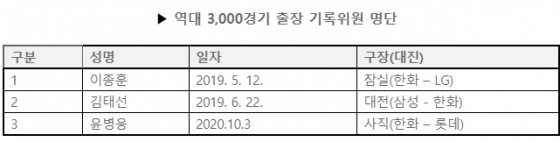 KBO 리그에서 3000경기 출장 기록을 달성한 기록위원은 이종훈, 김태선, 윤병웅 위원 등 총 3명밖에 없다. 이 기록위원은 11일 광주에서 열리는 LG와 KIA의 경기에서 역대 4번째 3000 경기 출장 달성의 주인공이 될 예정이다.
