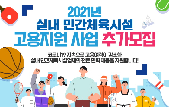 실내 민간체육시설 고용지원 사업은, 코로나19 장기화로 고용여력이 감소한 실내 체육시설업체들을 위해 전문인력(트레이너, 코치 등)의 재고용 또는 신규채용에 필요한 인건비를 1인당 월 160만원씩 최대 6개월간 지원하는 사업이다.