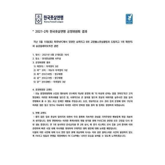 연맹은 “좋지 않은 일로 풋살이 알려지게 돼 우리 종목에 지속적인 관심을 가져주었던 팬분들께 제일 죄송하다”라며 “‘더 이상의 선처는 없을 것’이라고 고지했음에도 이러한 폭력 사태를 일으킨 점, 사회적으로 큰 물의를 일으켜 풋살 이미지를 실추시킨 점을 들어 연맹에서 줄 수 있는 최고 징계인 제명을 줬다”라고 설명했다.