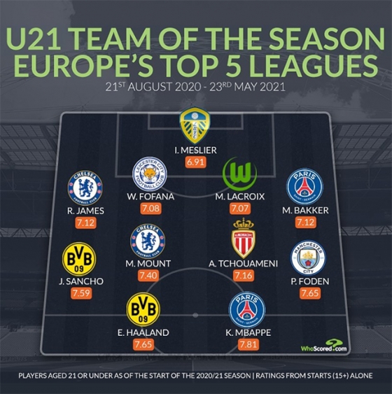 축구 통계 사이트 '후스코어드닷컴'은 28일(한국시간) 유럽 5대 빅리그에서 뛰고 있는 U-21 선수들 가운데 평점이 높은 순으로 베스트11을 꾸렸다. 2020~2021시즌이 시작되는 시점(2020년 8월 21일) 당시 만 나이가 21세 이하였던 선수들이 대상이 됐다. 1998년 12월생인 음바페도 지난해 8월 당시 만 21세여서 이번 U-21 베스트11 대상에 포함됐다.