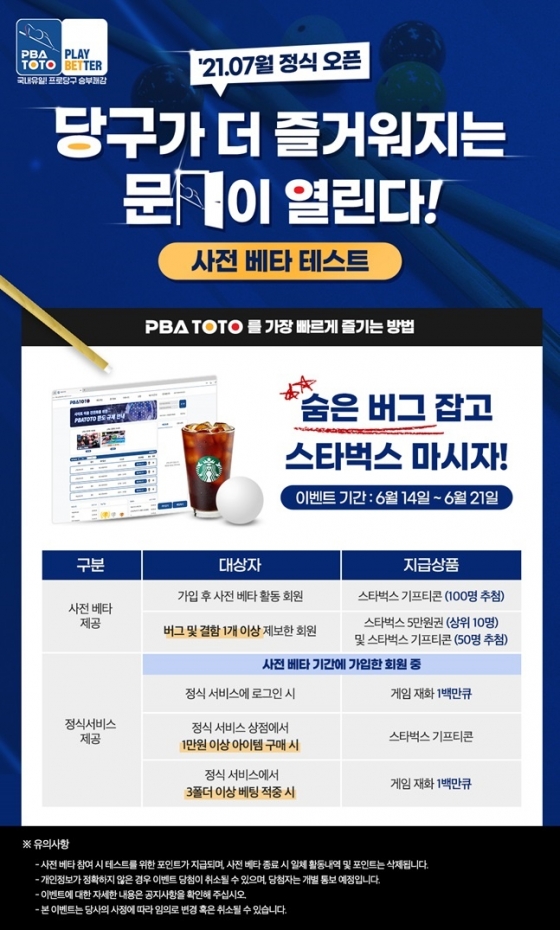 이번 '블루원리조트 PBA-LPBA 챔피언십' 동안 실시하는 오픈베타 기간에 가입한 회원에게는 모든 서비스가 무료로 제공되고, 정식 오픈 시 사용할 수 있는 특별 아이템들이 주어진다. 또한 오픈베타 기간 활발한 활동을 한 참가자들을 대상으로 스타벅스 상품권 등 경품이 지급된다.