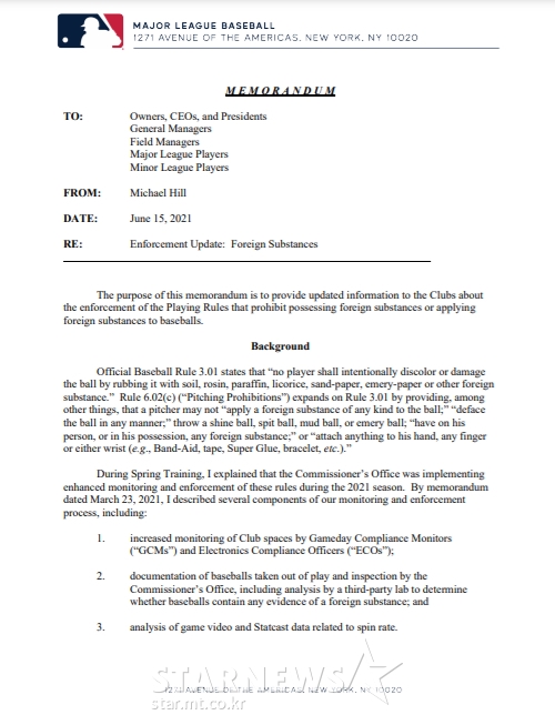 메이저리그 사무국은 16일(한국시간) 빅리그 30개 구단 전체에 보낸 공문을 통해 '투수가 경기 중 이물질을 사용하는 것에 대해 단속과 처벌을 하겠다'고 공식 발표했다. 이는 오는 21일부터 적용된다.