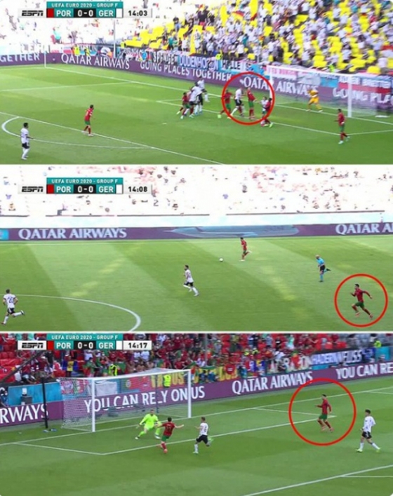 그런 호날두가 경기 시작 15분 만에 독일 골망을 흔들었다. 그것도 자신이 수비하고 냅다 달려 마무리하는 완벽한 카운터어택이었다. 호날두는 독일의 코너킥을 머리로 클리어링 한 뒤 상대 진영으로 쏜살같이 내달렸다. 'ESPN'의 보도에 따르면 15초도 안 되는 짧은 시간에 자기편 골대서 상대 문전까지 도달했고 디오고 조타의 패스를 침착하게 선제골로 연결했다.