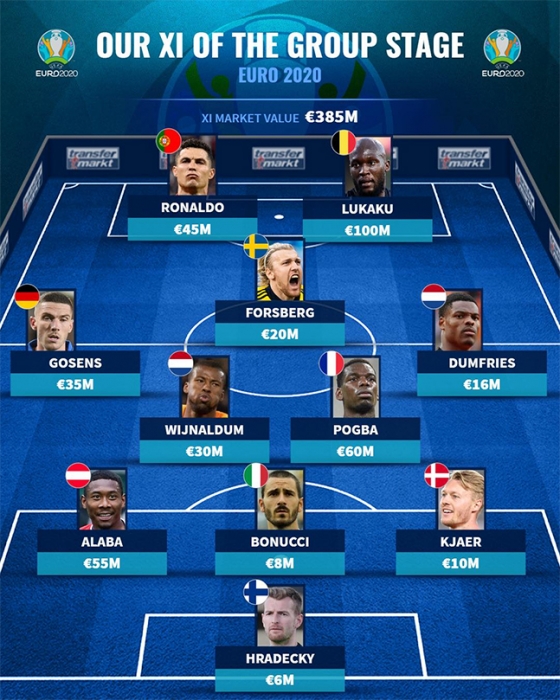 이적 전문 사이트 트랜스퍼마르크트는 25일(한국시간) 유로2020 조별리그 활약상을 토대로 한 자체 베스트11을 선정해 공개했다. 3-5-2 포메이션을 틀로 선수들이 선정됐고, 네덜란드에서 가장 많은 2명의 선수를 배출했다. 베스트11 몸값 총액은 3억8500만 유로(약 5211억원)다.