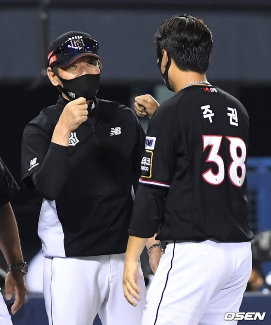 헌데 주권이 9회말 선두타자 홍창기에게 안타를 맞으면서 계획이 꼬였다. 이강철 감독은 "역시 이러면 안되나 싶은 마음도 들었다"고 털어놨다. 정석대로 김재윤을 처음부터 올렸어야 했나 후회했다는 이야기다. 이 감독은 후속 판단을 신속하게 내렸다. 김재윤 대신 주권이 한 타자를 더 상대했다. 주권은 이천웅의 보내기번트를 병살 처리했다. 순식간에 주자가 사라지며 아웃카운트 2개가 올라갔다. 김재윤이 편안하게 세이브를 거뒀다.